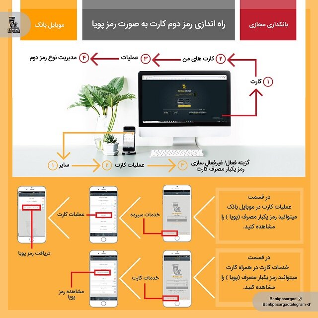 به منظور کاهش مخاطرات مرتبط با استفاده از رمز دوم کارتهای بانکی، افزایش امنیت و جلوگیری از سوء استفاده سودجویان، امکان فعالسازی و دریافت رمز دوم کارت بهصورت رمز پویا و یک بار مصرف، با سهولت و بدون نیاز به نصب اپلیکیشنهای جدید، از طریق سامانههای بانکداریالکترونیک بانکپاسارگاد فراهم است.