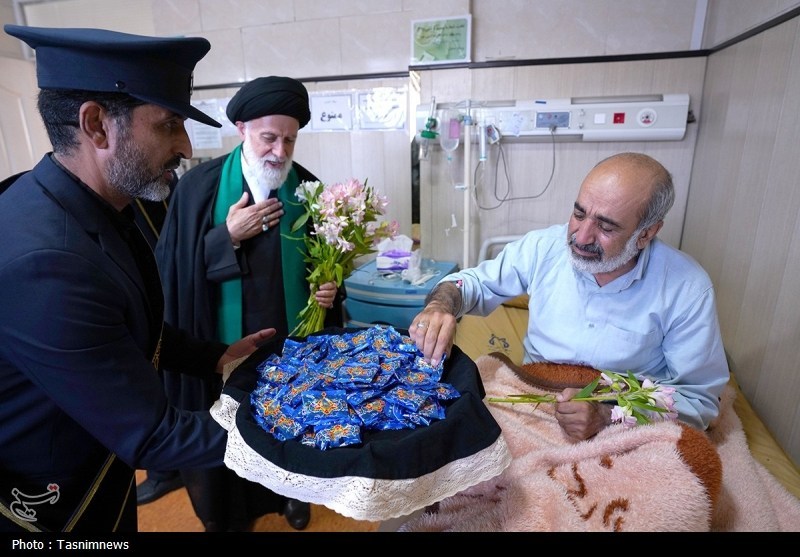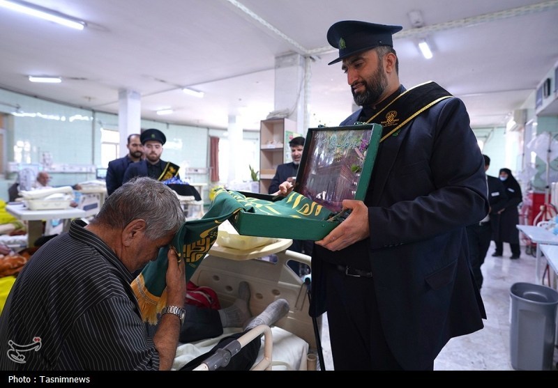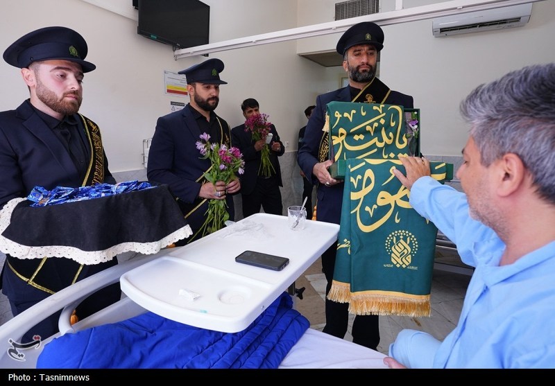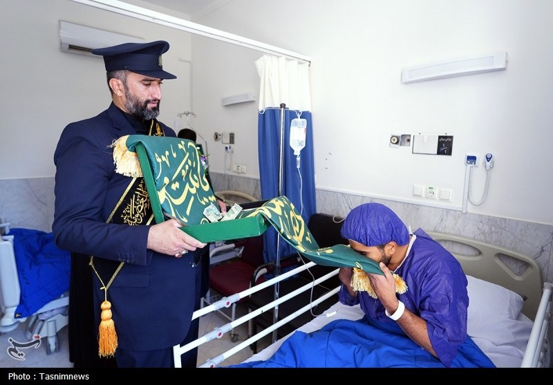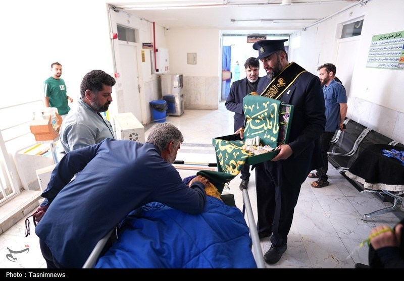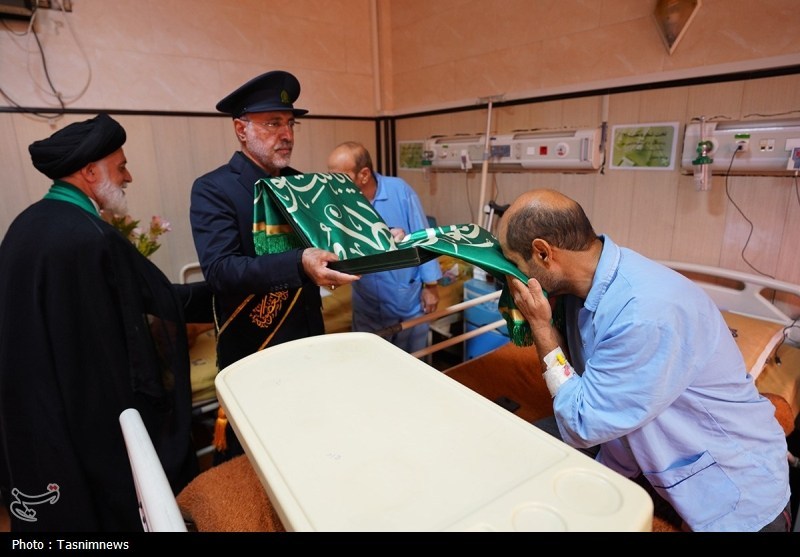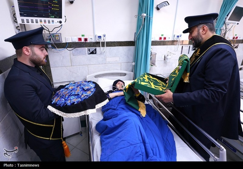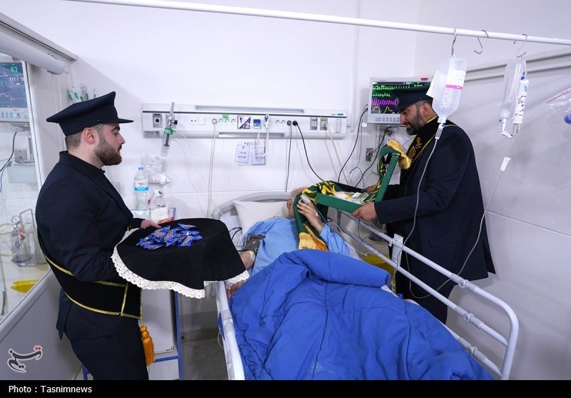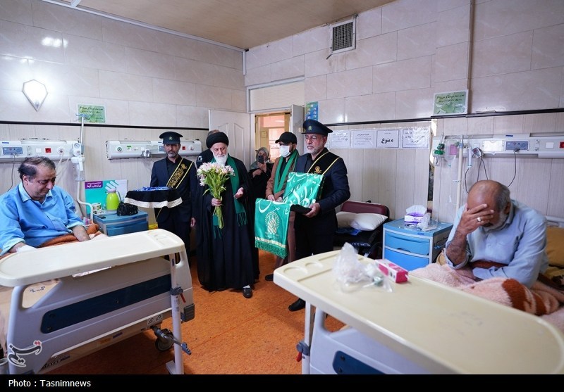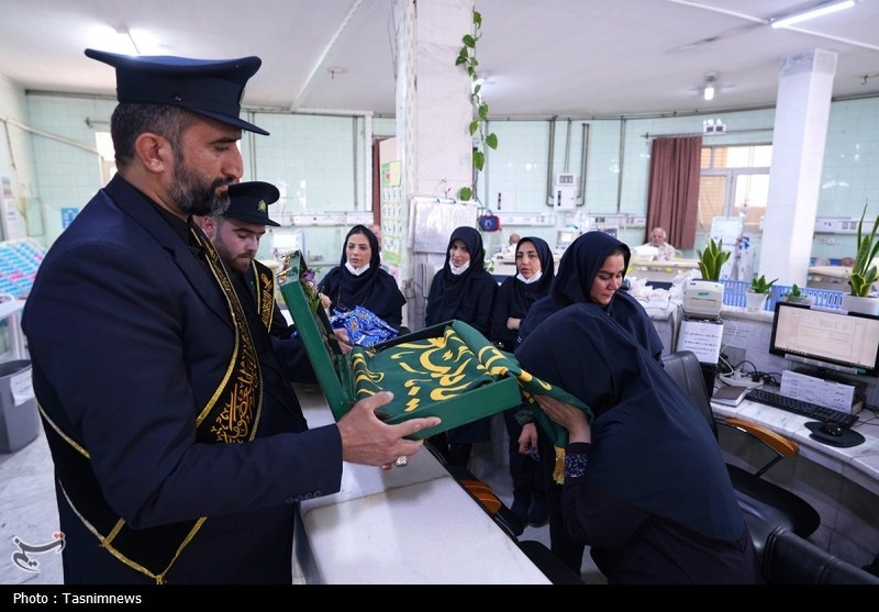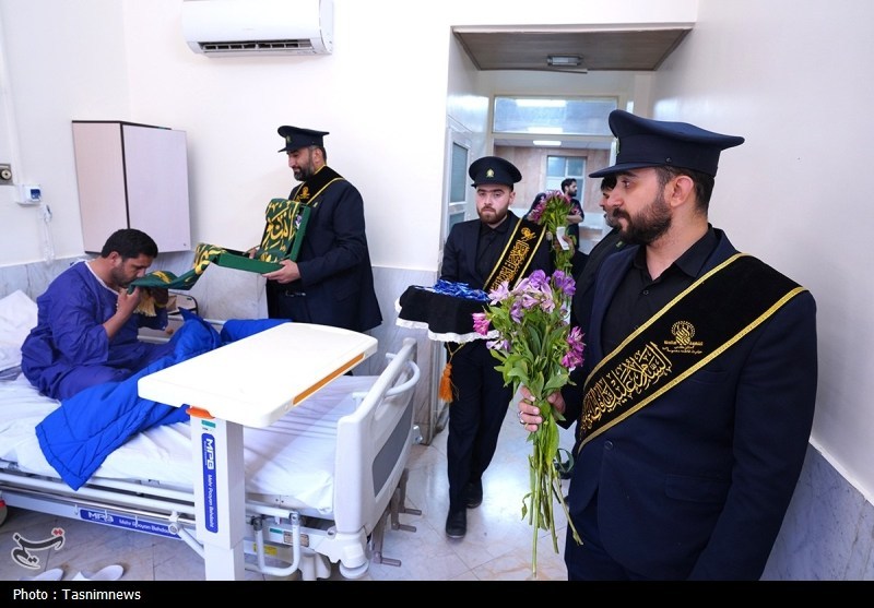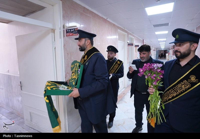 خادمان حرم مطهر حضرت فاطمه معصومه سلام الله علیها به همراه پرچم متبرک حرم مطهر در آستانه سالروز رحلت بانوی کرامت با حضور در دو بیمارستان از بیماران عیادت کردند.