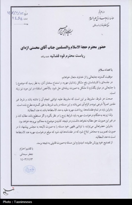 دفتر آیت الله سبحانی نوشت: «این نامه با هدف تبیین برخی از چالشهای موجود در اجرای احکام مرتبط با مهریه و ارائه پیشنهادهایی برای اصلاح و بهبود روندهای قانونی تنظیم شده است.
