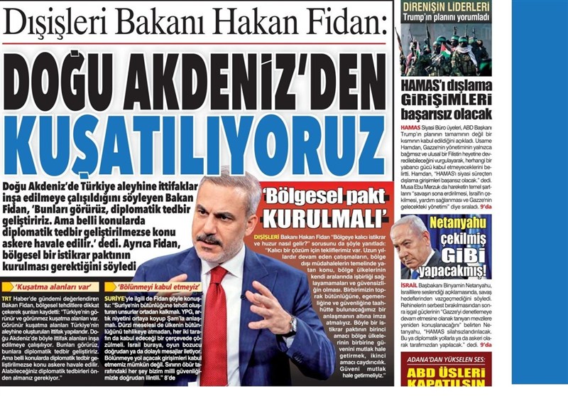 حالا اقدامات یونان، قبرس و رژیم صهیونیستی، ترکیه را بیش از هر زمانی نگران کرده و روزنامه آیدنلک چاپ آنکارا، از قول هاکان فیدان وزیر امور خارجه ترکیه نوشته است: «ما عملاً در شرق مدیترانه محاصره میشویم.
