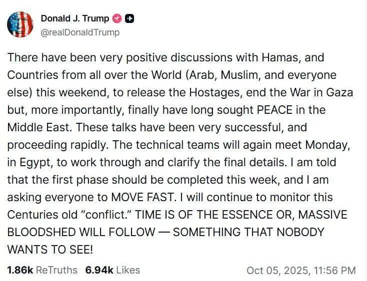 دونالد ترامپ در پستی در سوشالتروث نوشت: گفتوگوهای بسیار مثبتی با حماس و کشورهایی از سراسر جهان (عرب، مسلمان و دیگران) در آخر هفته انجام شده است تا برای آزادی گروگانها، پایان دادن به جنگ در غزه و از همه مهمتر، دستیابی به صلحی که مدتهاست در خاورمیانه جستوجو میشود، تلاش شود.