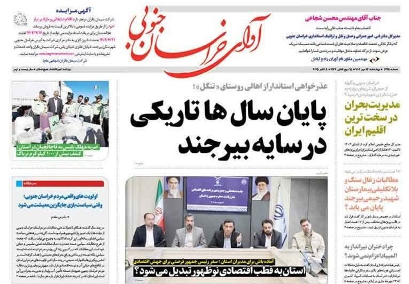 روزنامه آوای خراسان جنوبی: عذرخواهی استاندار از اهالی روستای تنگل (پایان سالها تاریکی در سایه بیرجند)، مدیریت بحران در سختترین اقلیم ایران، مطالبات زغال سنگ و بلاتکلیفی بیمارستان شهید رحیمی پایان مییابد، چرا دختران تیرانداز به المپیاد اعزام نمیشوند؟