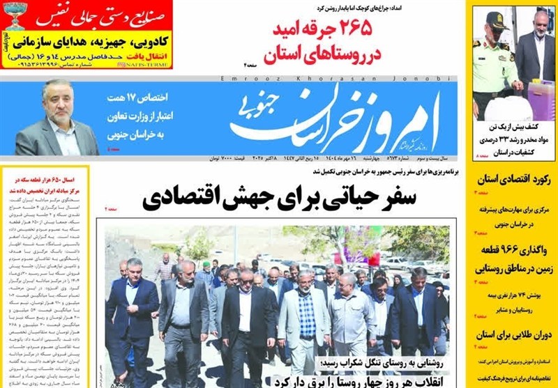 روزنامه امروز خراسان جنوبی: سفر حیاتی برای جهش اقتصادی، 265 جرقه امید در روستاهای خراسان جنوبی، رکود اقتصادی استان، واگذاری 966 قطعه زمین در مناطق روستایی، سفر حیاتی برای جهش اقتصادی، لالاییها روایت بی کلام مادران، خراسان جنوبی مقصد 75 گردشگر خارجی.