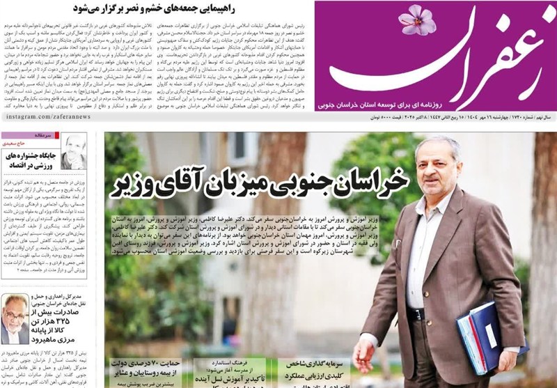 روزنامه زعفران: خراسان جنوبی میزبان آقای وزیر، راهپیمایی جمعههای خشم و نصر برگزار میشود، جایگاه جشنوارههای ورزشی در اقتصاد، صادرات بیش از 325 هزار تن کالا از پایانه مرزی ماهیرود، حمایت 70 درصدی دولت از بیمه روستاییان و عشایر.برق رسانی به 99.9 درصد جمعیت روستاهای خراسان جنوبی، وقف 42 میلیارد تومان موقوفه در خراسان جنوبی.