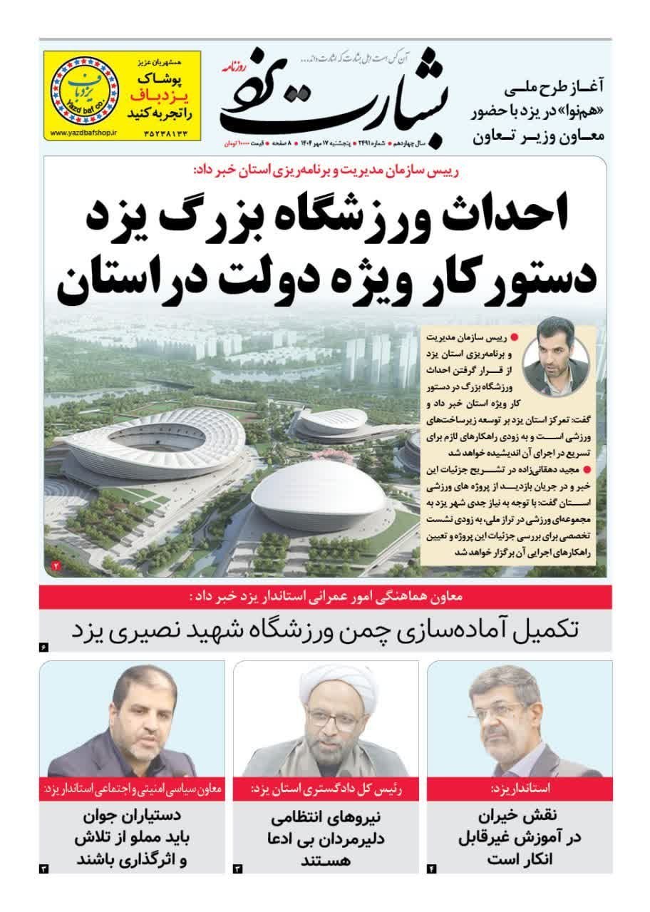 تصاویر برگزیده روزنامه های پنج شنبه 17 مهر در استان یزد منتشر شد و بازتابی از مهم ترین رویدادها و دغدغه های روز این استان و اخبار یزد را به نمایش گذاشت.