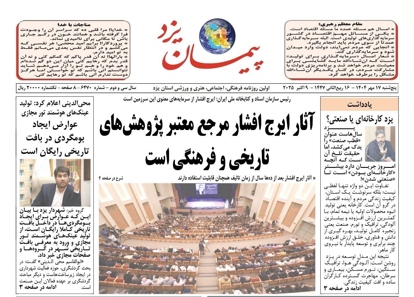 منتخب صفحات نخست روزنامههای یزد این امکان را برای مخاطبان فراهم میکند که در یک نگاه، مروری جامع بر مهمترین تیترها و موضوعات روز و اخبار یزد داشته باشند و تصویری روشن از اولویتها و دغدغههای رسانهای استان به دست آورند.