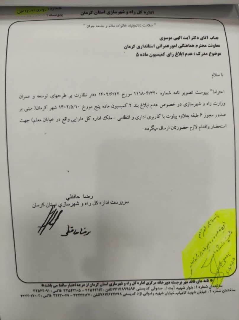 وی بیان کرد: سازمان امور مالیاتی برای احداث ساختمانی هفت طبقه در محدوده شهری کرمان از شهرداری درخواست مجوز کرد.