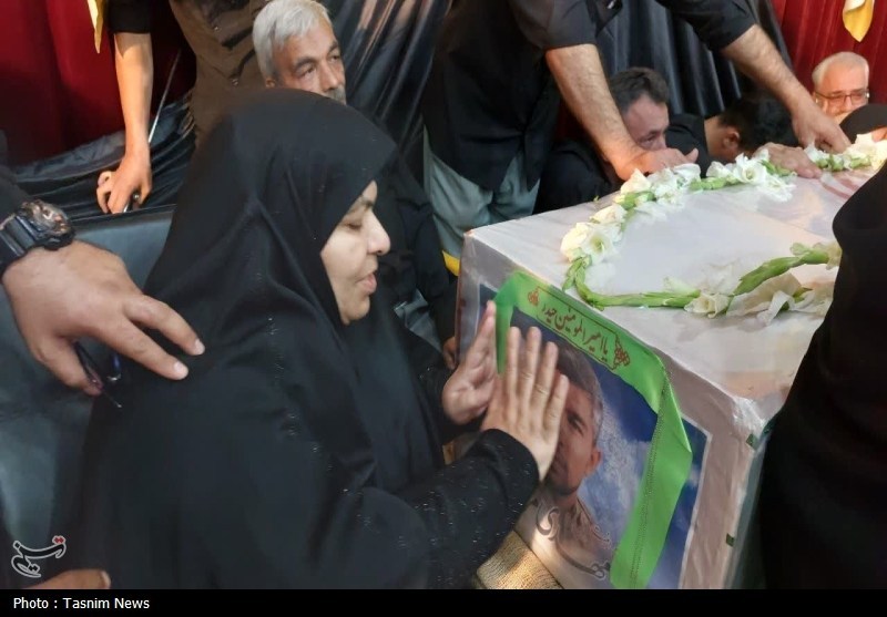 بسیجیان جوان با چشمانی سرخ از گریه، دستهایشان را به سوی تابوت شهید دراز کرده و با صدایی لرزان، «لابیک یا شهید» فریاد میزدند.