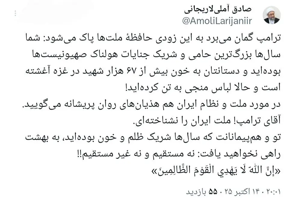آیتالله صادق آملیلاریجانی در حساب کاربری خود در شبکه اجتماعی ایکس نوشت: