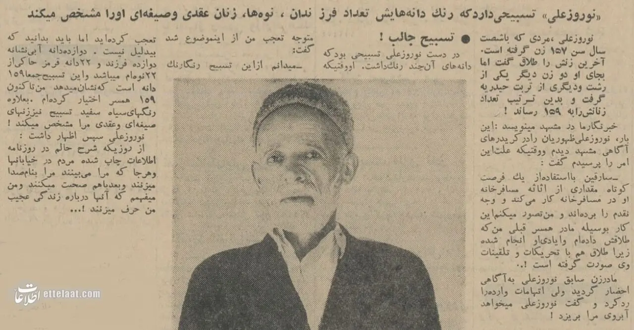 مردی ۶۰ ساله در مشهد به نام نوروزعلی در مهر ماه ۱۳۴۴ بعد از طلاق همسر ۱۵۷ خود همزمان با عقد دو زن به رکورد ۱۵۹ ازدواج رسید.