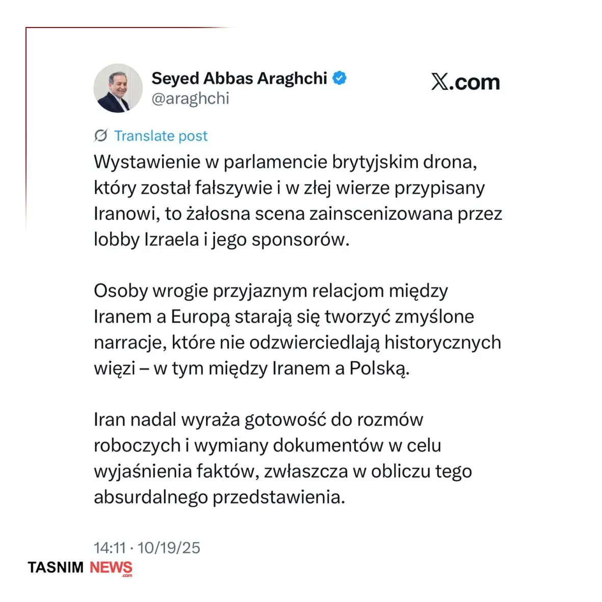 وزیر امور خارجه در توییتی نوشت: نمایش یک پهپاد در پارلمان بریتانیا، که به دروغ و با سوء نیت به ایران نسبت داده شده است، صحنه ای تأسفبار است که توسط لابی اسرائیل و حامیان آن به اجرا در آمده است.