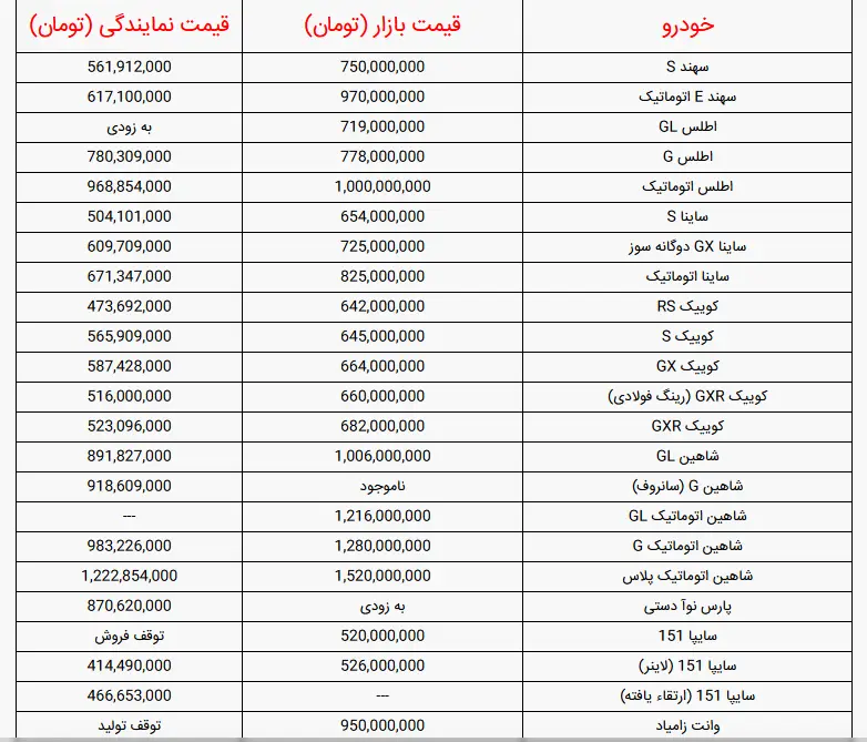 قیمت متوسط بازار آزاد و قیمت نمایندگی خودروهای سایپا امروز جمعه ۲ آبان ۱۴۰۴ را در جدول زیر مشاهده نمایید.