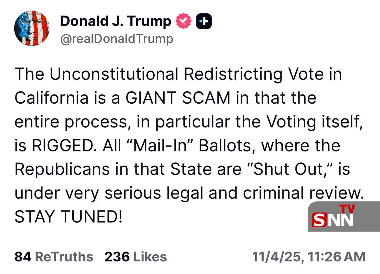 رئیسجمهور آمریکا در صفحه شخصی خود نوشت: رأیگیری غیرقانونی برای ترسیم مجدد حوزههای انتخاباتی در ایالت کالیفرنیا یک کلاهبرداری بزرگ است، چرا که کل این روند، بهویژه خودِ رأیگیری، بهطور کامل دستکاری شده است.