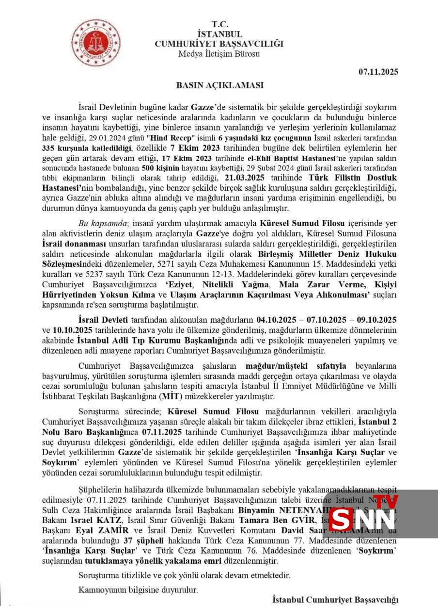 در بیانیه دفتر دادستانی استانبول آمده است: «حکم بازداشت برای ۳۷ مظنون از جمله بنیامین نتانیاهو نخست وزیر رژیم صهیونیستی و اسرائیل کاتز وزیر جنگ به اتهام نسلکشی و جنایت علیه بشریت صادر شده است.»