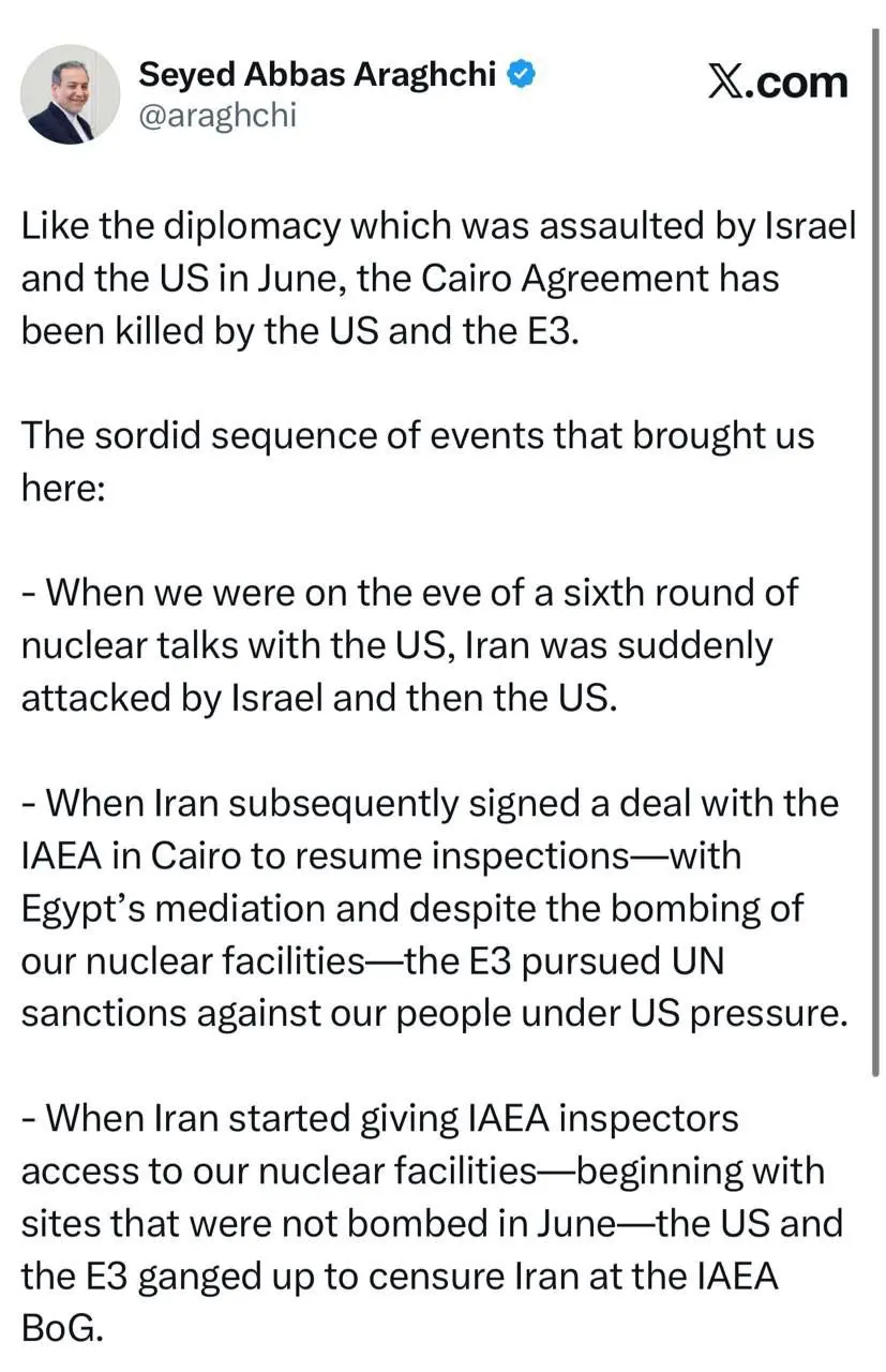 وزیر امور خارجه در خصوص خاتمه توافق قاهره نوشت: همانطور که دیپلماسی در ماه خرداد توسط اسرائیل و آمریکا مورد تهاجم قرار گرفت، «توافق قاهره» نیز توسط آمریکا و سه کشور اروپایی کشته شد.