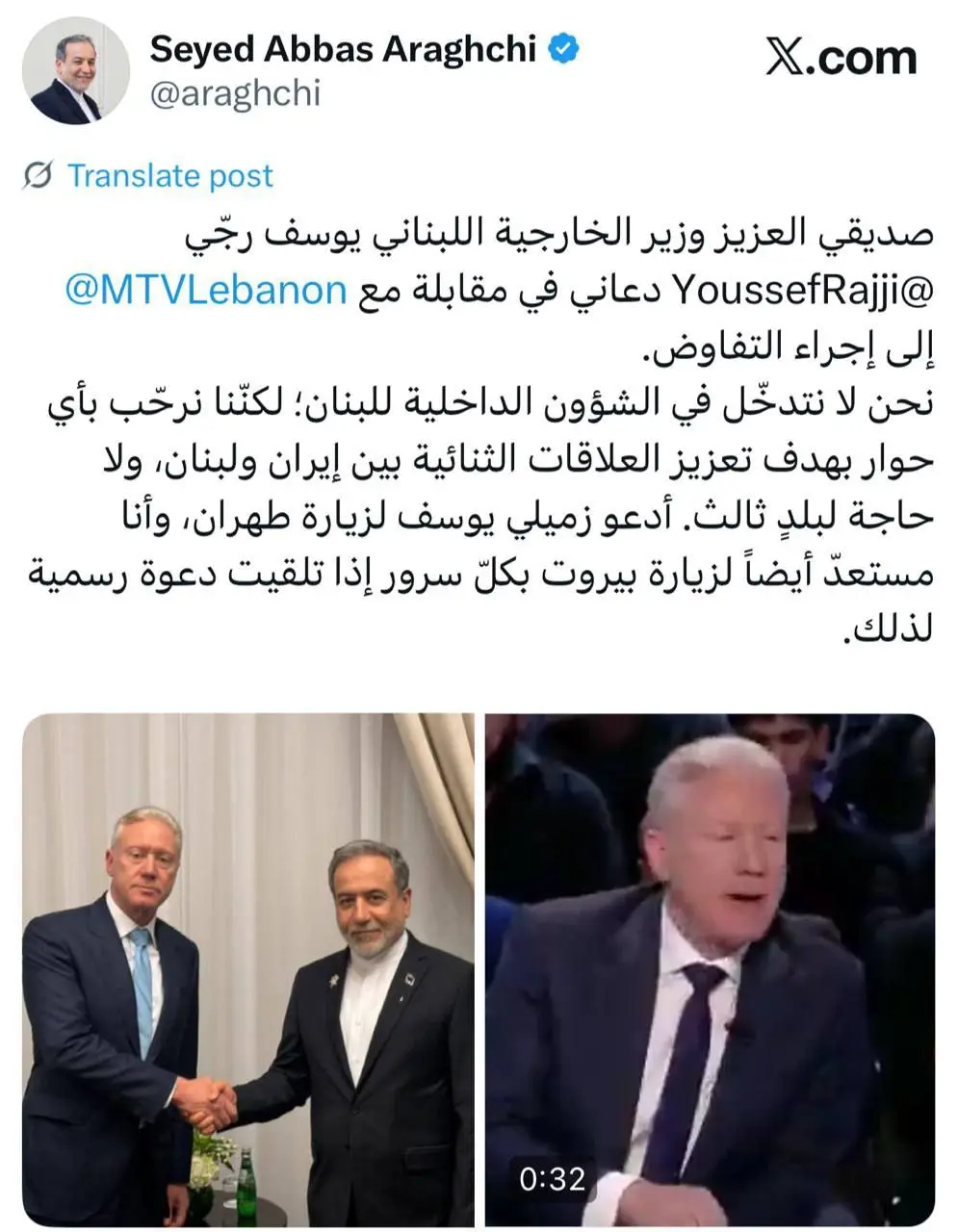 وزیر خارجه ایران در پاسخ به دعوت وزیر خارجه لبنان برای مذاکره گفت: دوست عزیزم یوسف رجی وزیر خارجه لبنان در مصاحبه با امتیوی لبنان، از من برای مذاکره دعوت کرده است.