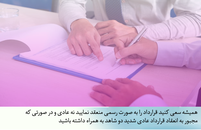 حتماً قرارداد خود را به صورت رسمی منعقد نمایید و یا اگر قراداد به صورت عادی میباشد سعی کنید هنگام انعقاد قراداد دو شاهد داشته باشید تا بعداً در اثبات به مشکلی بر نخورید.