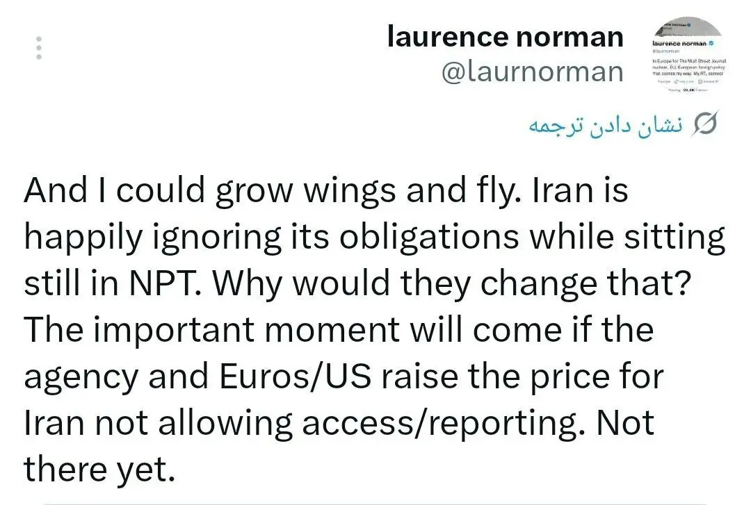 لارنس نورمن خبرنگار وال استریت ژورنال در شبکه اجتماعی اکس نوشت: ایران همچنان با خوشحالی تعهداتش را نادیده میگیرد اما در NPT میماند.