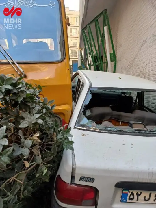 جرثقیل در حین حرکت با پالتهای شیشه، دیوار یک ساختمان و دو خودرو شامل یک دستگاه افامسی و یک دستگاه پراید برخورد میکند و خساراتی به بار میآورد.