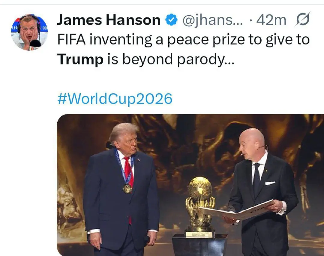 فیفا چیز مسخرهای به نام «جایزه صلح فیفا» اختراع و آن را به ترامپ اهدا کرد، چون «صلح نوبل» جایزه واقعی به او نداد.