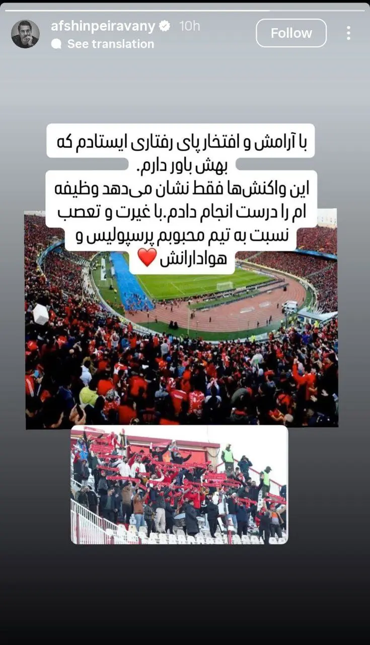 پیروانی در این استوری نوشت: «با آرامش و افتخار پای رفتاری ایستادم که بهش باور دارم.