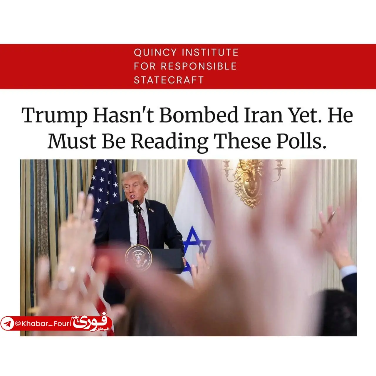 اندیشکده کوئینسی اعلام کرد: یکی از دلایلی که ترامپ به ایران حمله نکرده، نظرسنجیهاس؛ فقط ۲۱ درصد آمریکاییها با حمله به ایران موافقند.